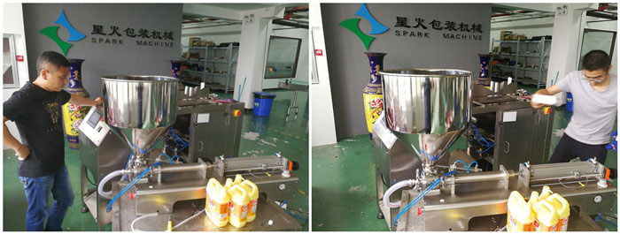 星火自立袋洗衣液自動(dòng)包裝機(jī)生產(chǎn)調(diào)試現(xiàn)場(chǎng):
