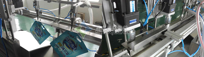 自立吸嘴袋灌裝旋蓋機(jī)適用于帶吸嘴自立袋的液體或粉劑或膏體的灌裝及封口。廣泛應(yīng)用于食品、飲料、釀造、醫(yī)藥等領(lǐng)域。例如:洗衣液、果凍、奶茶,酸奶﹑果汁﹑豆?jié){、豆奶、調(diào)味品、醬料、飲料、富氫水等其他食品的充填封口。
