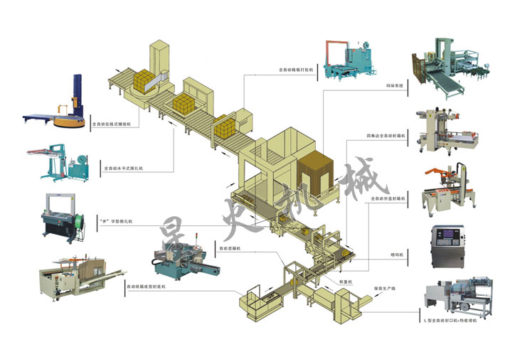 本流水線所用到的產(chǎn)品包括:自動開箱機(jī)、L型全自動封口機(jī)+熱收縮機(jī)、自動裝箱機(jī)、稱重機(jī)、噴碼機(jī)、全自動折蓋封箱機(jī)、全自動四角邊封箱機(jī)、井字型捆扎機(jī)、碼垛系統(tǒng)、全自動棧板打包機(jī)、全自動水平式捆扎機(jī)、全自動在線式纏繞機(jī),其中機(jī)械可配套流水線使用,亦可單機(jī)作業(yè)。