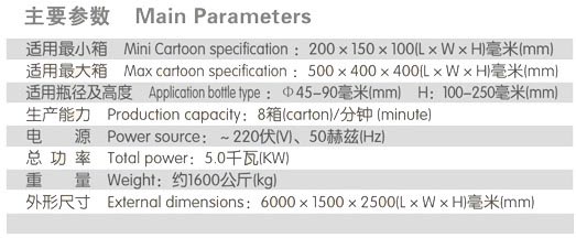 配套瓶裝生產(chǎn)線的后道全自動(dòng)裝箱生產(chǎn)。同時(shí)擁有多項(xiàng)國(guó)家技術(shù)專li,整機(jī)性能可靠,產(chǎn)能高,包裝效果美觀。