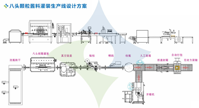 醬料灌裝生產(chǎn)線(xiàn)/醬料灌裝真空旋蓋生產(chǎn)線(xiàn)由理瓶機(jī)、六頭醬料灌裝機(jī)、全自動(dòng)真空旋蓋機(jī)及收瓶機(jī)組成,主要針對(duì)粘稠并帶有顆粒類(lèi)的醬狀物料灌裝而設(shè)計(jì)的,自動(dòng)進(jìn)瓶、自動(dòng)感應(yīng)灌裝;特別適用于調(diào)味品中帶顆粒并且濃度較大的麻辣醬、香辣醬、牛肉醬、豆辨醬、鮮辣醬、海鮮醬、咖喱醬、四川豆豉、牛油火鍋底料、紅油火鍋底料等物質(zhì)的粘稠醬類(lèi)的灌裝。