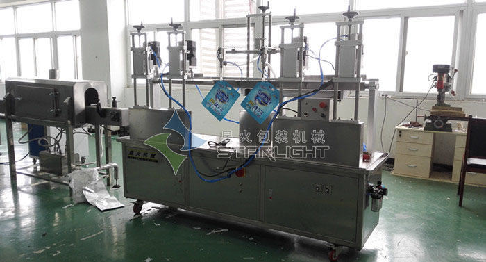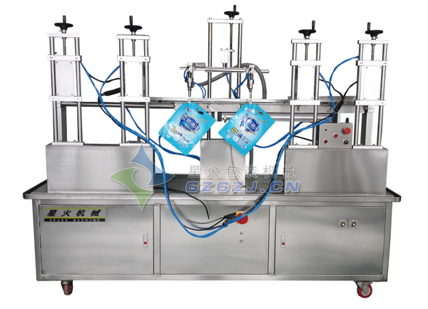 星火機(jī)械專業(yè)生產(chǎn)洗衣液吸嘴自立袋灌裝機(jī)/洗衣液吸嘴自立袋灌裝旋蓋機(jī),整機(jī)采用氣電相結(jié)合,只需人工上袋、上蓋,就能夠?qū)崿F(xiàn)自動灌裝(兩次)、旋蓋、退袋等一系列工序,達(dá)到節(jié)能高效的目的;可根據(jù)客戶需求要增減部分功能;該機(jī)與物料接觸部分均采用304不銹鋼材料制作,產(chǎn)品衛(wèi)生,機(jī)器造型美觀,外觀光亮整潔;該機(jī)的自動旋蓋裝置采用磁力+齒輪旋蓋、壓力可調(diào),袋蓋緊實(shí)不遺漏、具有自動打滑功能使旋蓋松緊適當(dāng);該機(jī)帶有光電眼監(jiān)測袋蓋裝置,無袋不灌裝,無蓋可及時報警提醒操作人員檢查,及時調(diào)整,避免浪費(fèi)。