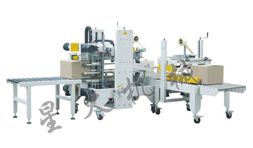 角邊封箱機XHG-50負責完成四角邊的紙箱膠帶封箱。與GPB-56配合使用,形成工字型封箱。