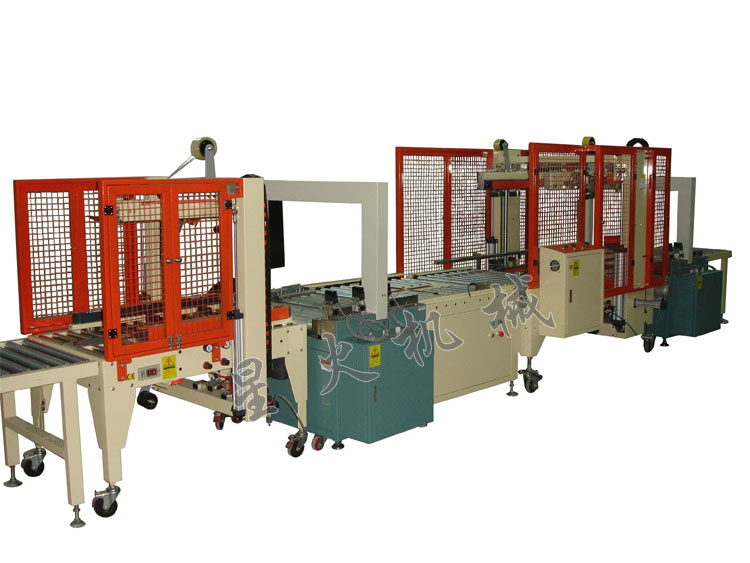 本包裝生產(chǎn)流水線主要操作流程:已裝好產(chǎn)品折好上蓋的產(chǎn)品箱從左邊的滾筒進入此流水線,進入Di一臺包裝機械:全自動一字型封箱機(進行一字型封箱)—→進入第二臺包裝機械:全自動打包機(打兩道打包帶)—→進入第三臺包裝機械:90°旋轉(zhuǎn)機—→進入第四臺包裝機械:全自動角邊封箱機(進入四角邊封箱,形成工字型封箱)—→進入很后的第五臺包裝機械:全自動打包機(打另外兩道的打包帶,形成井字形打包)—→工字型封箱+井字型打包完成。